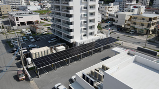 琉球銀行は、環境問題への取り組みの一環として、2025年2月、北谷支店の駐車場にカーポート型太陽光発電設備を設置。発電した電力は北谷支店内で消費する。