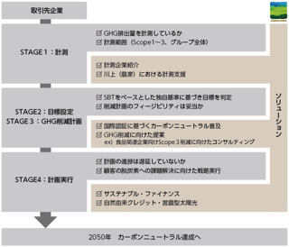 気候変動に伴うリスク認識に基づく対話の実施、現状や課題、対応状況の把握。2024年度より全ての融資先における気候変動への取り組み段階の評価、ヒアリングや公開情報の活用による実施。特定の高排出セクターに対する移行リスク管理、深度ある対話およびトランジション支援の実施。セクターや地域特性を踏まえた移行に向けた取り組み進捗評価基準の策定。移行の速度や対応の十分性を判断するための気候関連リスク管理視点に基づくエンゲージメントの検討。企業のカーボンニュートラル達成までの道程の把握、「計測」「目標設定」「GHG削減計画」「計画実行」の4つのステージにおける位置付けと課題の把握し、具体的なソリューションの提供を試行。