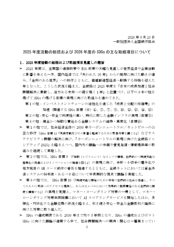 また、2025年度の全銀協の主な活動状況や会員銀行のSDGsに関する取組事例等を掲載した「全銀協SDGsレポート2025-2026(暫定版)」を作成しましたので、併せて公表いたします。