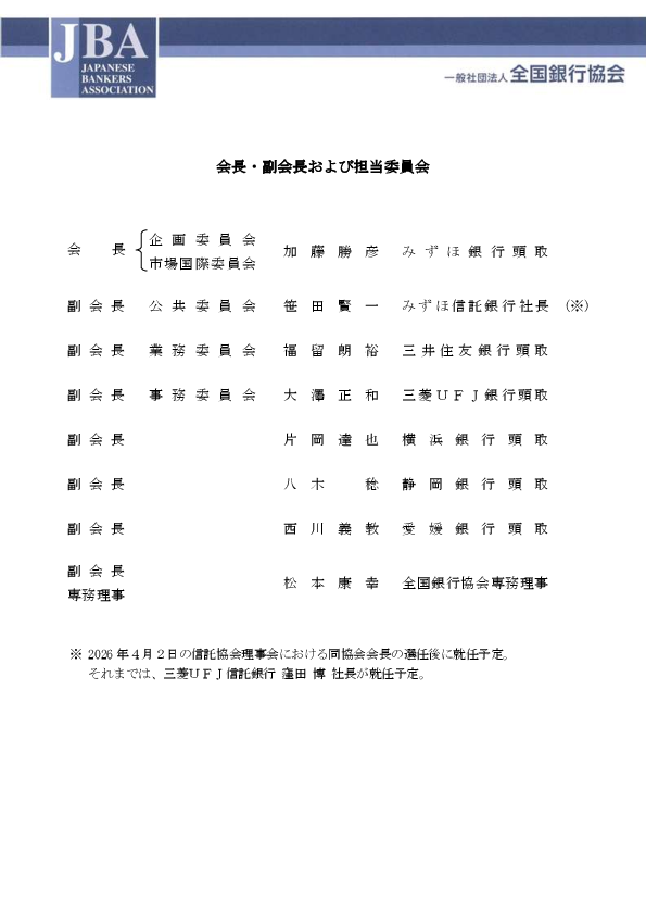 本日付で、みずほ銀行の加藤頭取が全銀協会長に選任された。新体制における会長、副会長はお手元の資料のとおりである。本日はこのほかに、加藤会長の略歴をお配りしている。