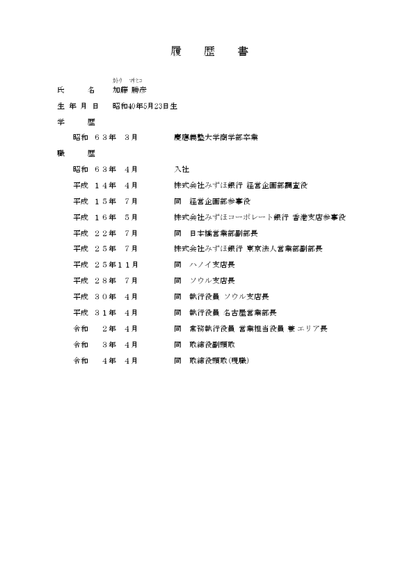 みずほ銀行の加藤です。