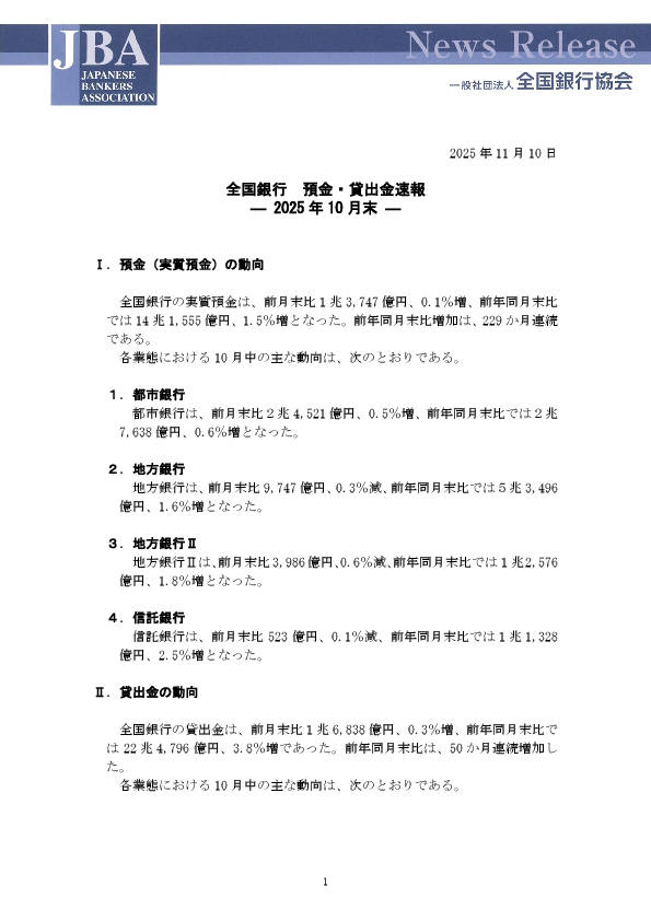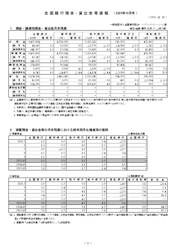 全国銀行 預金貸出金速報など